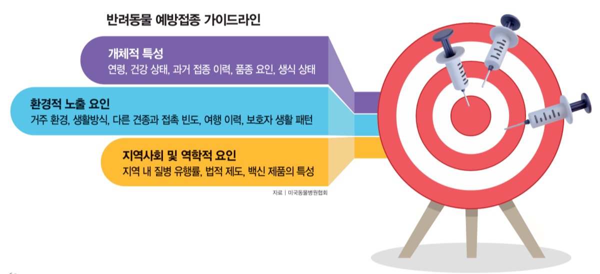 미국동물병원협회(AAHA)는 반려동물 예방접종에 대한 국제 기준을 제시한다. 세계에서 가장 폭넓게 쓰이는 가이드라인인데, 2003년부터 3~5년에 한 번씩 개정판을 발표하고 있다. 가장 최근인 2022년 5차 개정판에선 반려동물이 매년 예방접종을 해야 한다고 권고하지는 않는다. 그 대신 개체 특성, 생활환경, 지역사회의 질병 유행 상황 등을 고려해 접종 주기를 정하면 된다고 설명한다.