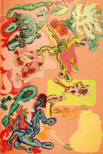 수갑 혹은 권총의 부품처럼 보이는 기계적 형태들이 원 사이를 부유한다. 그 원들은 커다란 유기물에 의해 뒤덮여 있다. 수갑 혹은 권총의 형태들은 이 유기물들로 침투해 들어가는 것 같기도 하고, 그것을 공격하는 것처럼 보이기도 한다.…