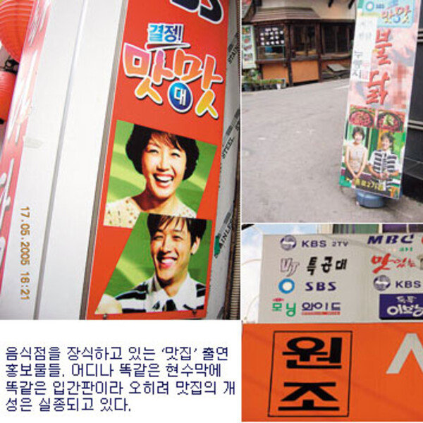 서울 중구의 한 ‘먹자’골목. 닭칼국수, 설렁탕, 매운탕, 회, 불닭 등 온갖 음식점들이 모여 있고, KBS MBC SBS 등 방송사 로고와 방송인들의 얼굴이 인쇄된 현수막이 먼저 손님을 맞는다. 이른바 ‘TV 출연 맛집’임을 알리…