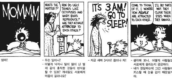 캘빈이 한밤중에 큰 소리로 엄마를 찾는다. 매혹의 조건에 대한 궁금증이 억제할 수 없을 정도로 강하게 일었기 때문이다. 하지만 엄마는 그것이 한밤중에 자신을 부를 만큼 급한 일이라고 생각하지 않아 “그만 자라”고 소리쳤다. 궁금함을…