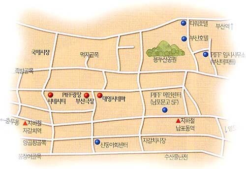 남포동은 부산국제영화제의 중심지다. 개·폐막작을 제외한 대부분의 영화가 이 일대 극장에서 상영된다. PIFF광장도 이곳에 있고 주변에는 상영하는 영화만큼이나 많은 식당이 있다.용두산공원은 용두산타워와 산책로, 미술전시관 등을 갖춘 …