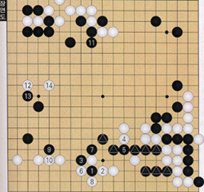 백14까지가 오전 대국. 여기서 점심시간. “1시간 뒤에 이세돌의 공격, 이창호의 타개 솜씨를 계속해서 감상하시죠.” 인터넷 생중계 진행자는 이렇게 1시간 뒤 오후 대국의 양상을 예고했다. 그리고 점심을 마친 뒤 이세돌 9단이 먼저…
