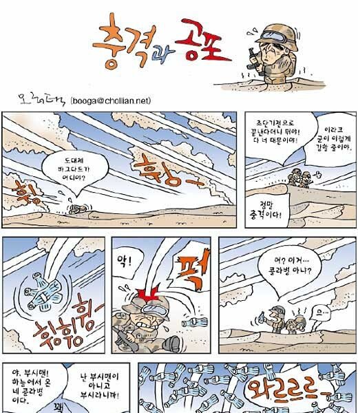 “이라크 국민들 미국 개그맨 보고 안 웃습니다. 그런 이라크에 우리 젊은 개그맨들을 보내자는 겁니까?” “우리 개그맨들에게 직접 개그를 하라는 것이 아닙니다. 허허. 이라크에 가면 개그말고도 코미디 세트 만들기 같은 할 일이 많습니…