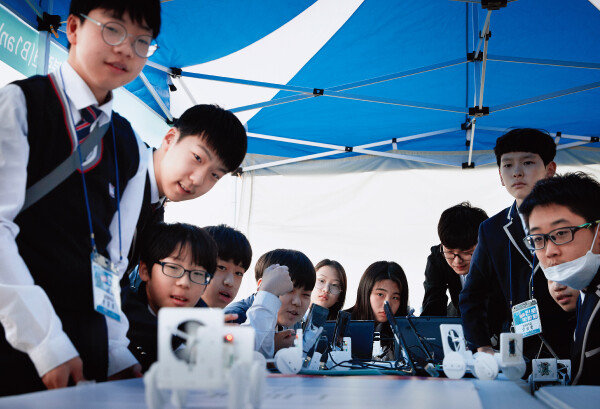 미래엔 어떤 새로운 직업이 있을까. 내 적성은 무엇일까. 제법 어른스럽게 장래를 고민하는 10대 청소년의 모습이 싱그럽다. 4월 25일 서울 마포구 월드컵공원 평화의공원에서 열린 ‘마포진로박람회’에 참가한 창천중 학생들이 드론 코딩…