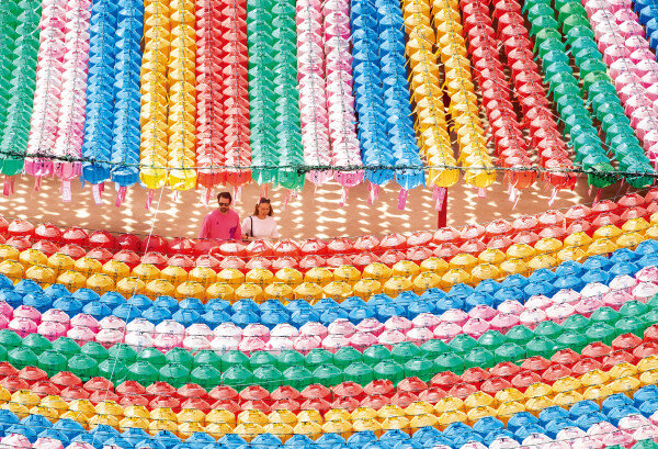 저마다 소원을 담아 정성껏 올리는 오색 연등이 하늘을 장식하는 계절이 왔다. 5월 12일 부처님 오신 날을 앞두고 서울 종로구 조계사에 설치된 오색 연등의 물결 아래로 외국인 관광객들이 지나가고 있다.