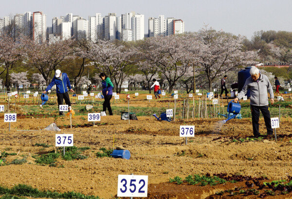 무르익은 봄, 더는 파종을 늦출 수 없다. 4월 18일 경기 안산의 한 도시농업농장에서 시민들이 각자에게 분양된 도시텃밭에 씨를 뿌리고 물을 주고 있다. 이들에게 주어진 미션은 화학비료나 농약을 사용하지 않는 친환경 재배. 초보 농…