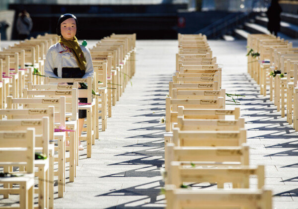 2017년 12월 27일 낮 12시, 일본군 위안부 문제 해결을 촉구하는 올해의 마지막 ‘수요집회’가 서울 종로구 옛 주한일본대사관 앞에서 열렸다. 매서운 칼바람에도 참석자 500여 명은 위안부 할머니의 명복을 빌고 “한일합의 무효…