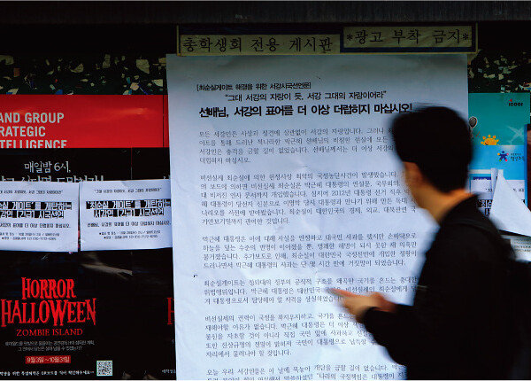 ‘최순실 비선 실세’ 파문으로 박근혜 대통령의 하야와 탄핵을 요구하는 대학가 시국선언이 전국으로 번지고 있는 가운데, 10월 26일 박 대통령의 모교인 서강대에도 국정 농단을 규탄하는 대자보가 붙었다.Canon EOS-1DX, IS…