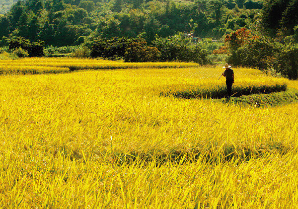 22일 경기 가평군 위곡리에서 벼 수확을 앞둔 농부가 논두렁을 걷고 있다. 올해 벼농사는 풍년이지만 수매가 하락으로 농민들의 한숨이 깊다. Canon EOS-1DX, ISO400, F16, T-1/250Sec, 렌즈 70-200mm