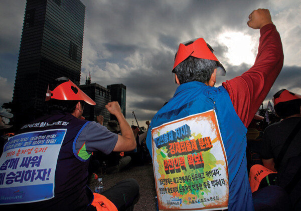 공공기관 성과급연봉제 도입과 관련해 한국노총 전국공공노동조합연맹과 민주노총 전국공공운수노동조합이 9월 29일 서울 여의도 문화광장에서 ‘노동개악 저지 성과퇴출제 분쇄 총파업 총력투쟁 결의대회’를 열었다. Canon EOS-1DX,…