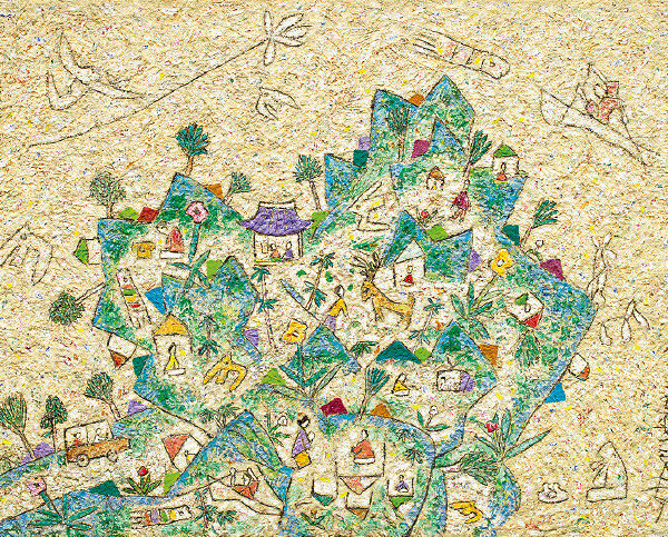 ‘제주생활의 중도’, 1999~2009년, 장지 위에 혼합, 193 X 253cm. [사진 제공·현대화랑]“중도(中道)란 평등을 추구하는 나 자신의 평상심에서 시작된다. 환경에 따라 작용하는 인간의 쾌락과 고통, 사랑과 증오, 탐욕…