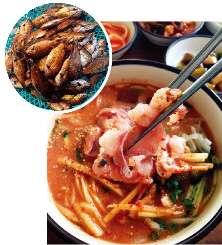 ‘보목해녀의집’의 자리물회(원 안).갑작스러운 ‘봄 실종 사건’으로 당황하는 이가 적잖다. 5월 더위가 한여름을 방불케 한다. 열로써 더위를 다스리는 이열치열(以熱治熱)을 택하는 이도 많지만 필자는 시원한 것으로 열기를 식히는 이냉…