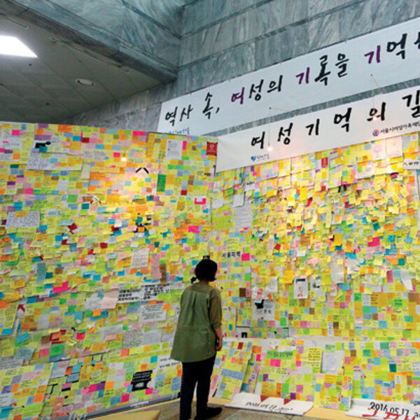 ‘강남역 묻지 마 살인사건’의 희생양이 된 여성을 추모하는 쪽지들이 서울 동작구 대방동 서울시여성가족재단 벽면 가득히 붙어 있다. Canon Eos-1DX, ISO1000, F4, T-1/125Sec, 렌즈 14mm