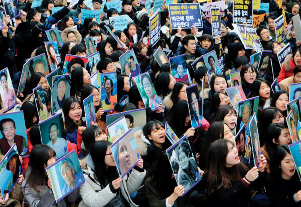 2015년 12월 30일 서울 종로구 일본대사관 앞에서 열린 1211차 수요집회 참가자들이 돌아가신 일본군 위안부 피해 할머니들의 사진을 들고 일본 정부의 사죄를 촉구하고 있다. 참가자들은 28일 타결된 한일 위안부 협상에 분노하며…