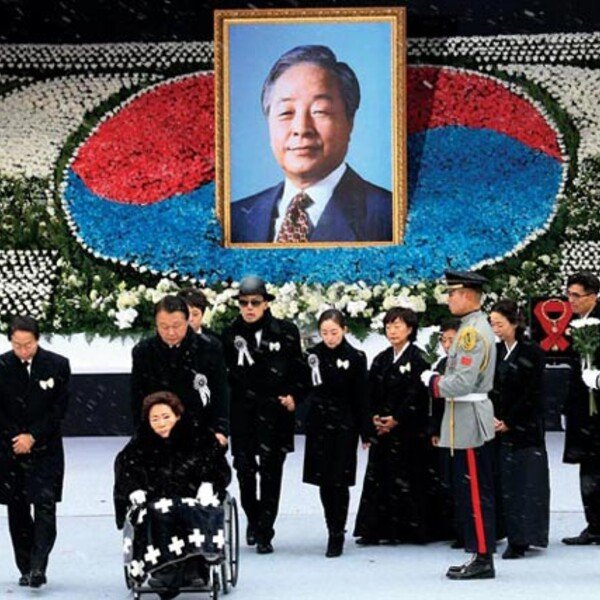 11월 26일 서울 여의도 국회에서 열린 김영삼 전 대통령 국가장에 참석한 유가족들이 헌화 후 연단을 나서고 있다…