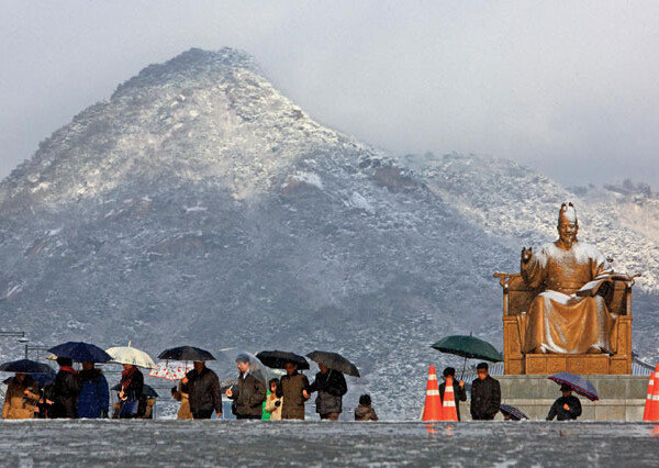 중부와 경북 내륙 곳곳에 올겨울 첫 대설주의보가 내려진 12월 3일 오전, 북악산을 배경으로 서울 광화문광장 일대에 눈이 내리고…