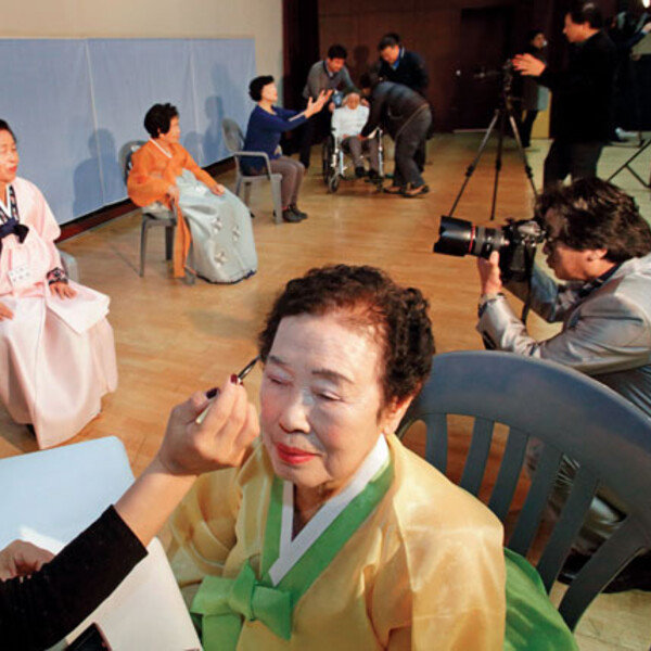 11월 19일 서울 동대문구청 강당에서 열린 저소득층 어르신 200여 명을 대상으로 한 ‘만수무강 청춘사진관’ 행사에서 어르신이 장수사진을 찍기 위해 메이크업을 받고 있다. Canon EOS-1DX, ISO 800, F8, T-1/…