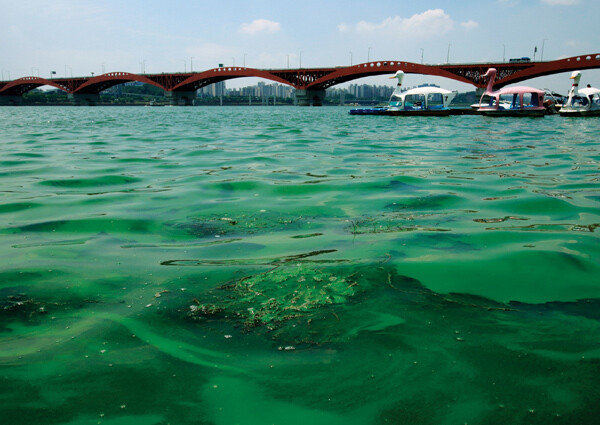 녹조의 심각성을 경고하는 조류경보제가 시행된 2000년 이후 15년 만에 처음으로 서울시가 잠실대교에서 행주대교까지 조류경보를 발령한 가운데 7월 2일 오후 서울 성산대교 주변 한강물이 녹조현상으로 짙은 녹색으로 변해 있다.C…