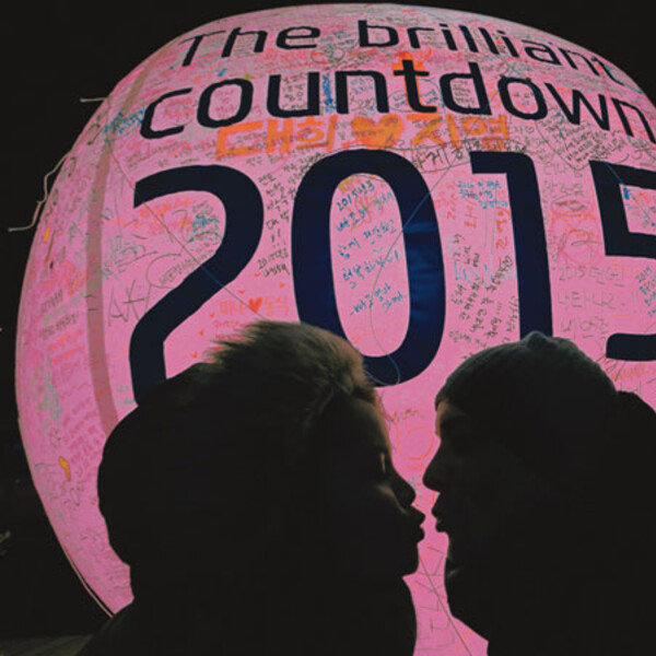 서울 강남구 강남역 근처에서 2015년 카운트다운 세리머니를 마친 연인이 새해 소망을 적은 애드벌룬 조명 앞에서 키스를 나누고 있다. Canon EOS-1DX, ISO 3200, F8, T-1/125Sec, 렌즈 14mm