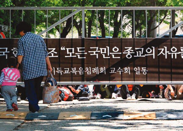 유병언 전 세모그룹 회장의 검찰 소환을 앞두고 공권력 투입에 반대하는 기독교복음침례회 (구원파) 신도들이 경기 안성 금수원(안성교회)으로 모여들고 있다(관련 기사 30쪽).Canon EOS-1D Mark Ⅳ, ISO 400, F11…