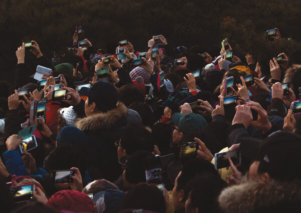 2014년 새해 첫 해돋이를 보려고 서울 광진구 아차산 정상에 모인 시민들이 휴대전화 카메라로 일출 광경을 촬영하고 있다.Canon EOS-1D Mark Ⅳ, ISO 1600, F11, T-1/125Sec, 렌즈 80-200mm
