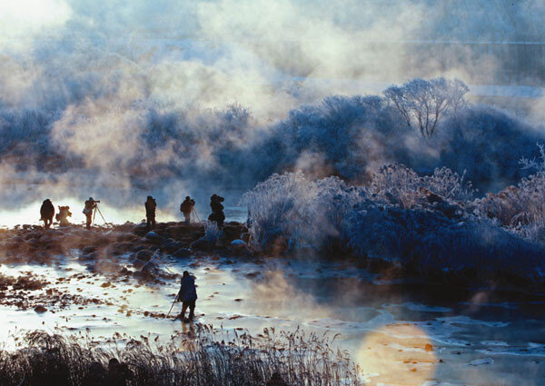 영하 20℃ 한파 속 강원도 춘천. 소양댐에서 방류한 물줄기에서 수증기가 피어 오르는 장면을 촬영하려고 사진가들이 모여 있다.Canon EOS-1D Mark Ⅳ ISO400, 렌즈 24-70mm t-1/160 F16