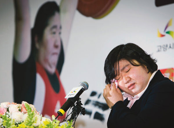 1월 10일 경기 고양시청 내 체육관에서 열린 은퇴 기자회견에서 한국 역도 간판스타 장미란이 하염없이 눈물을 흘리고 있다.Canon EOS-1DX ISO1000, 렌즈 70-200mm t-1/250 F4.5