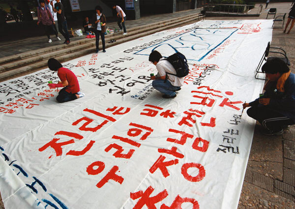 서울대 법인화에 반대하는 서울대생 100여 명이 5월 30일부터 총장실이 자리한 본관을 점거하고 농성 중이다. 대학본부 복도에 앉아 책을 읽고 총장실에서 공부하는 ‘비폭력 공부 시위’라고 한다. “본관을 비우면 대화하겠다”고 오연천…
