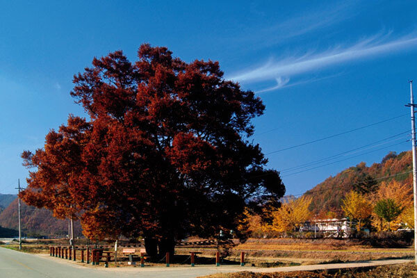 붉게 물든 이파리 풍성한 느티나무 한 그루가 길가에 우두커니 서서 나그네를 반긴다. 느티나무 뒤편, 아담한 초등학교 분교장에는 아이들도 하나 없다. 고요하다. 마을 어귀에서 흔히 만날 수 있는 느티나무이건만, 한적한 길 위에서 홍조…