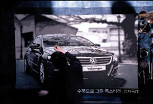 하얀 화면과 진한 먹물이 작가의 손을 통해 선과 번짐으로 이어진다. 부분적인 외관이 점차 하나의 자동차로 완성된다. 농담(濃淡)으로만 표현된 고급차는 그렇기에 더욱 미려하다. 그림 속 자동차는 어느덧 실사(實寫)로 변해 저 멀리 질…