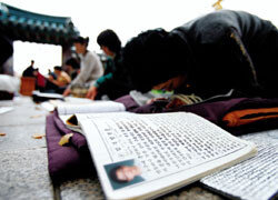 “대자대비하신 부처님, 삼보(三寶)님께 절 올리오니 끝없는 공덕 바다 법계에 두루 하며, 지혜 광명을 온 사바세계에 뿌려주소서. 두려운 시험 앞에서 부처님 자비로 맑디맑은 지혜의 샘 폭포수로 깨우시고, 번뇌하고 나태하여 천 갈래 만…