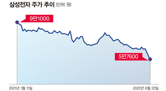 주가 폭락은 삼성전자만의 문제는 아니다. 코스피는 6월 22일 2342.81에 장을 마쳐 2020년 11월 2일 이후 1년 7개월 만에 최저치를 기록했다. 같은 날 코스닥도 749.96에 마감해 종가 기준 2020년 7월 2일 이래 가장 낮았다. 하루 만에 국내 주식시장에서 시가총액 약 64조 원이 증발한 것이다.