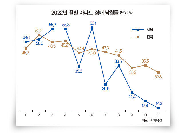 법원경매 전문업체 ‘지지옥션’에 따르면 11월 한 달간 경매로 나온 서울 아파트 물건 162건 중 낙찰 사례는 23건에 그쳐 낙찰률 14.2%를 기록했다(그래프 참조). 전월(17.8%) 대비 3.6%p 내린 것으로 관련 집계가 시작된 2001년 1월 이후 22여 년 만에 최저치다(코로나19 사태로 법원이 휴정한 2022년 3월 제외). 같은 달 전국 아파트 경매 낙찰률은 32.8%로 전월(36.5%)보다 3.7%p 하락해 올해 최저치를 기록했다. 경기 지역 아파트 낙찰률(40.8%)이 전월(31.9%) 대비 8.9%p 올라가는 등 일부 상승 움직임도 있었으나, 방배동·여의도동·목동 등 서울 주요 지역 ‘유망주’ 단지는 응찰자가 없어 유찰되고 있다. 11월 전국 아파트 낙찰가율(감정가 대비 낙찰가 비율)도 78.6%를 기록해 2013년 5월 이후 처음으로 80% 선이 붕괴했다. 같은 시기 서울 아파트 낙찰가율은 83.6%로 전달(88.6%)보다 5%p 내려 5개월 연속 하락세를 이어갔다.