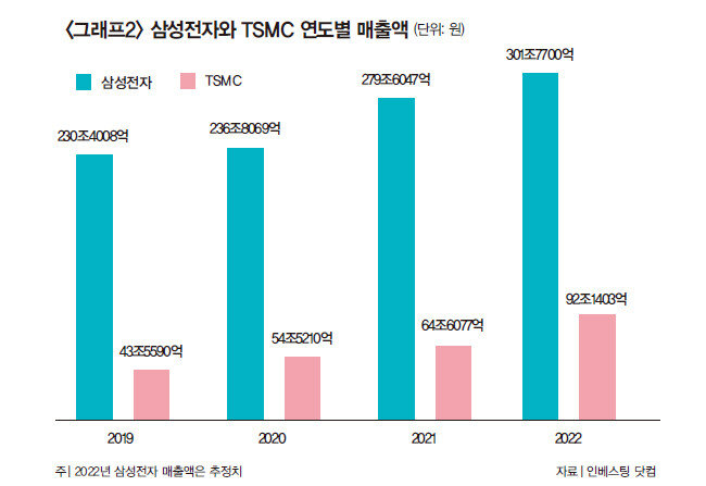 단순하게 보면 반도체 불황기에는 TSMC가, 호황기에는 삼성전자가 강한 셈이다. 다만 삼성전자는 종합 반도체 기업인 만큼 메모리 반도체 사업 중심으로 운영되는 SK하이닉스나 마이크론 등 경쟁 업체에 비해 경기 불황에 강한 모습을 보인다. 마이크론은 지난해 9~11월 이미 적자에 접어들었다.