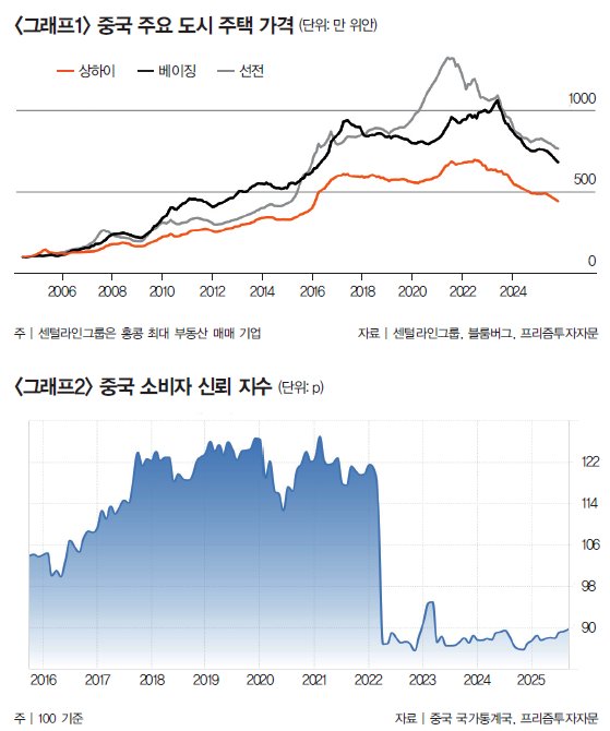 2022년 봄 중국 당국이 이른바 ‘상하이 봉쇄’를 단행한 것이 결정타가 됐다. 중국 국가통계국이 발표하는 소비자 신뢰지수는 2022년 4월부터 급락했고, 현재까지도 소비자심리가 회복될 징후는 보이지 않는다(그래프2 참조). 이처럼 부동산개발 회사의 연쇄 부도에 이어 소비심리마저 위축되자 부동산시장은 돌이킬 수 없는 국면에 처했다.