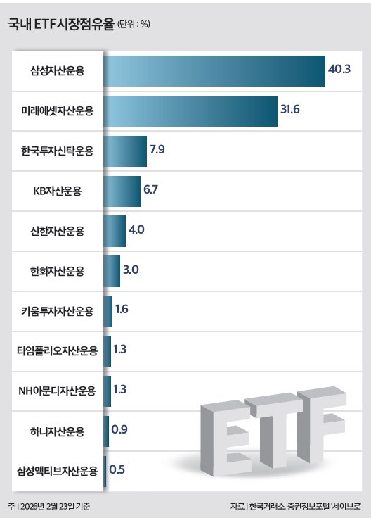 한국거래소에 따르면 2월 23일 기준 국내 ETF 순자산 규모는 약 371조3667억 원이다. 약 298조2461억 원이던 연초 대비 약 25% 오른 것이다. 증권정보포털 ‘세이브로’에 따르면 운용사별로는 삼성자산운용이 약 149조6590억 원으로 순자산이 가장 많았다. 연초 약 114조1512억 원에서 31% 증가했다. 시장점유율은 38.3%에서 40.3%로 올라 2024년 3월 말 이후 약 1년 10개월 만에 점유율 40%대를 회복했다(그래프 참조). 이어 미래에셋자산운용(117조1686억 원), 한국투자신탁운용(29조5113억 원), KB자산운용(24조9362억 원) 순으로 순자산이 컸다.