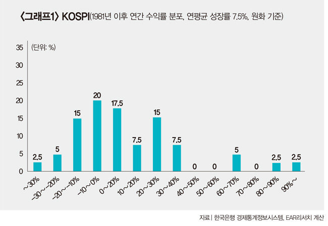 이 부분에서 한 가지 의문을 제기하는 독자가 있을 것이다. “저렇게 빈번하게 마이너스 성과가 출현하는데, 어떻게 3000포인트 벽을 넘을 수 있었는가”라고 말이다. 그 답은 10년에 한 번 발생하는 ‘대박장’이다. ‘그래프1’의 가운데를 중심으로 오른쪽에 위치한 4번의 고수익 국면에 주식시장 레벨이 크게 올라갔고 이때를 놓친 투자자는 주식투자에서 재미를 보기 어려웠다. 참고로 연평균 주가 기준으로 가장 높은 성과가 발생한 해는 외환위기 직후인 1999년으로 한 해 동안 98.7% 상승한 바 있다.