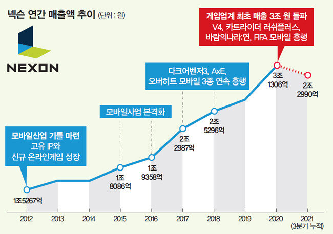 2020년은 넥슨이 게임업계 최초로 매출 3조 원을 돌파해 또 한 번 도약을 기록한 해다. 이정헌 넥슨코리아 대표의 ‘선택과 집중’이라는 기치 아래 넥슨의 강점 중 하나인 라이브 서비스 역량을 한층 끌어올린 결과였다. ‘V4’ ‘카트라이더 러쉬플러스’ ‘FIFA 모바일’ ‘바람의나라: 연’으로 이어지는 잇단 흥행에 힘입어 모바일 연간 매출 1조371억 원이라는 역대 최대 기록을 경신하는 한편, ‘메이플스토리’ ‘던전앤파이터’ ‘서든어택’ 등 개인용컴퓨터(PC) 온라인 스테디셀러 또한 성장을 거듭했다.
