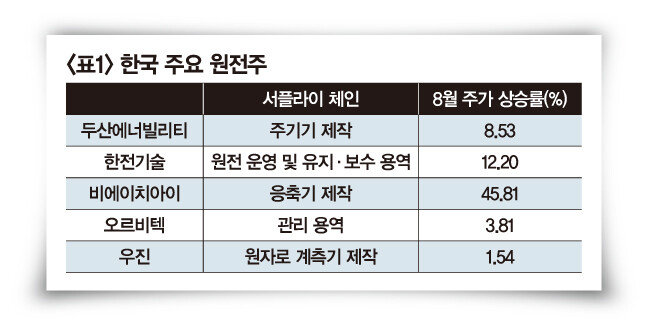 원전이 친환경 에너지로 분류되면서 각종 지원이 늘어나는 점 역시 긍정적 요인이다. 8월 16일 발효된 미국 인플레이션 감축법(IRA)은 원전을 청정에너지로 규정하고 있다. 원전 사업자는 2024년부터 메가와트시(㎿h)당 15달러의 세액공제를 받는다. 유럽연합(EU)도 7월 원전을 녹색분류체계(Taxonomy·택소노미)에 포함하기로 결정했다. 택소노미는 온실가스 감축과 탄소중립을 위해 필요한 경제활동을 분류한 체계로, 1조 유로(약 1389조 원) 규모의 그린딜 예산을 지원하는 내용을 골자로 한다. 이에 상대적으로 재정 상황이 좋지 않은 동유럽 국가들을 중심으로 원전 설치가 이뤄질 수 있다는 전망이 나온다. 체코와 폴란드 등이 잠재적인 수주 풀로 분류된다. 원전업계 한 관계자는 “각국의 전력 수급 계획에 따라 원전 산업이 흘러가는 상황이라 에너지 수급 방향을 유심히 지켜보고 있다”고 말했다.다만 잇따른 호재에도 원전주 투자에는 주의가 필요하다. 원전주가 ‘테마주’로 분류되면서 최근 주가가 급등한 탓이다. 한국거래소는 8월 24일 두산에너빌리티를 ‘스팸 관여 과다종목’으로 지정했다. 주식 관련 스팸문자 신고와 주가, 거래량이 동시에 급증해 투자에 유의가 필요하다는 이유에서다. 원자력 산업에 대한 투자 심리가 확대되면서 밸류에이션도 높게 형성됐다. 관련 기업 중 흑자를 내고 있는 두산에너빌리티와 한전기술마저 9월 15일 기준 주가수익비율(PER)이 각각 134, 145배에 달한다. 코스피 평균 PER는 9.5배 수준이다.