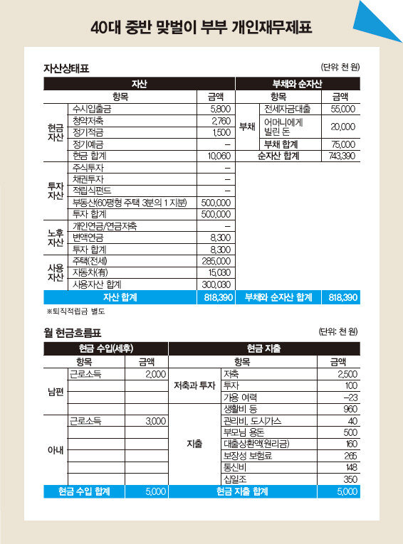 A 총자산은 약 8억1800만 원이며 부채 7500만 원을 제외하면 순자산은 7억4300만 원 정도입니다. 시부모가 공동명의인 단독주택은 당장 현금화가 어렵고 언제 받게 될지도 모르기에 이 부분을 제외하면 순자산은 2억4300만 원가량입니다.