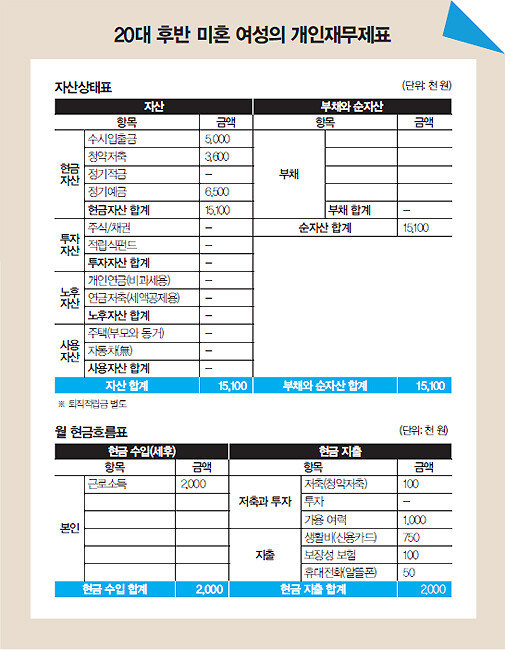 매년 초 본인 재무제표를 작성할 것을 권합니다. 미혼인 경우에는 소득 대비 50% 이상을 저축과 펀드에 투자하고, 생활비는 40% 이내로 관리하는 것이 필요합니다.