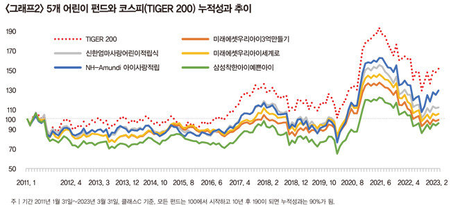 결과적으로 어린이 펀드는 코스피 ETF와 매우 비슷하게 움직이는데 상대적으로 수익은 적다. 펀드 성과가 저조한 이유 중 하나는 비용 때문이다. 5개 어린이 펀드의 총비용(총보수+기타 비용+판매 수수료+매매·중개 수수료)은 평균 2.46%다. 코스피200을 추종하는 ETF의 과거 연수익률이 3.5%인 반면, 5개 어린이 펀드의 평균 수익률이 0.6%인 이유는 이 비용이 설명해주는 듯하다. 어린이 펀드의 과거 성과가 안 좋았으니 미래 성과도 나쁠 것이라고 주장하는 게 아니다. 하지만 어느 날 갑자기 다른 모습을 보일 거라고 상상하기도 쉽지 않다. 따라서 상품을 선택하기 전 꼼꼼히 따져보는 지혜가 필요하다.