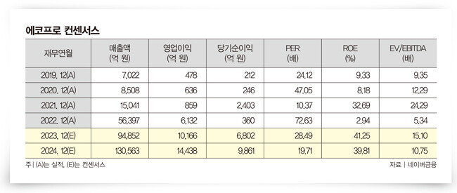 “간단한 방법은 네이버증권 애플리케이션(앱)에서 기업별 컨센서스를 확인하는 것이다. 여기에는 과거부터 향후 3년 실적까지 전망돼 있다. 실적을 확인할 때는 매출과 영업이익, 당기순이익이 2~3년 후에도 지속적으로 증가하는지를 봐야 한다. 물론 수치가 맞냐 틀리냐는 논란이 될 수 있지만, 트렌드를 봐야 한다는 얘기다. 또한 기업이 현재 돈을 잘 버는 건 중요하지 않다. 앞으로 2~3년 후 실적이 중요하다. 현재 돈을 잘 번다고 해서 매수했는데, 실적 피크아웃이면 오히려 고점에 물릴 수 있기 때문이다. 2020년 삼성전자도 반도체 슈퍼사이클을 맞아 역대급 실적과 함께 주가가 고공 행진했지만, 당시 향후 실적 악화가 전망되고 있었다. 최근 2차전지 돌풍을 이끈 에코프로를 살펴보면 올해 당기순이익이 지난해 대비 약 20배 증가하고, 내년에는 올해 대비 50%가량 늘어날 것으로 나타나면서 주가가 급등했다(표 참조)”.