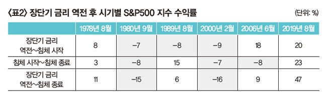 세 번째 질문은 “장단기 금리 역전 이후 주가가 하락했는가”다. 경기침체기였던 6번의 장단기 금리 역전 이후 미국 주가지수의 움직임을 살펴보자. 금리 역전 이후 경기침체 시작까지 주가가 빠졌던 경우는 3번이다(표2 참조). 나머지 경우는 지수가 8%, 18%, 20% 상승했다. 경기침체 시작 후 침체가 끝나기까지 주가가 하락한 경우 역시 3번이다. 역전 이후 침체 종료까지 기간을 보면 주가가 하락한 경우는 2번으로 줄어든다. 최근의 신호가 발생했던 2022년 7월 6일 이후 2023년 5월 15일까지 S&P500 지수는 8% 상승했다.