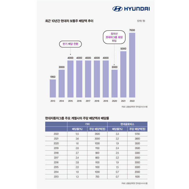 현대차 배당액은 정 회장 취임 이듬해인 2021년을 기점으로 가파르게 증가했다. 주당 배당액이 2년 사이 3000원에서 7000원으로 133.33% 증가한 것이다(그래프 참조). 현대차는 2015년 연 배당 정책에서 반기 배당 정책으로 전환한 이래 5년 동안 주당 배당액을 4000원으로 동결했다. 같은 기간 주가가 16만9000원에서 12만500원으로 하락한 만큼 배당률은 증가했으나, 물가인상률을 고려하면 사실상 배당금은 줄어들었다.