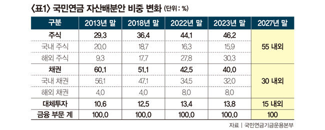 이날 회의에서 기금위는 실질경제성장률과 물가성장률 전망을 고려해 향후 5년간 목표수익률을 5.6%로 정했다. 이를 달성하기 위해 설정한 2028년 말 기준 자산군별 목표 비중은 △주식 55% 내외 △채권 30% 내외 △대체투자 15% 내외다. 자산군별 세부 목표 비중은 ‘국민연금법’ 제103조의2에 따라 기금운용 업무의 공정한 수행과 금융시장의 안정에 미치는 영향을 고려해 공개하지 않았다. 하지만 자산군별 목표 비중만 봐도 앞으로 국민연금이 기금을 어떤 방향으로 운용해나갈지 엿볼 수 있다.