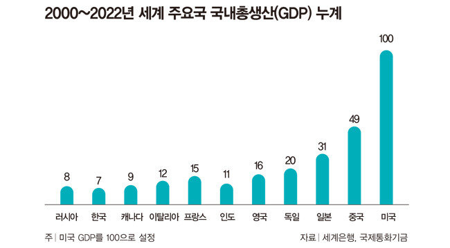 “미국 경제 조사 전문기관 콘퍼런스보드(CB)와 투자은행 골드만삭스는 2030~2035년 사이 중국이 미국을 추월할 것이라고 보는 반면, 일본과 영국은 추월 불가로 예측한다. 그럼에도 미국이 지금처럼 연 1~2% 성장하고 중국이 연 4~5% 성장하면 시간문제일 뿐, 중국의 미국 추월은 가능할 전망이다. 다만 경제 규모가 미국을 추월한다고 해서 곧바로 중국이 패권국이 되는 것은 아니다. 국력이나 경제력은 누적 개념으로 봐야 한다. 중국의 현 GDP는 미국의 73% 선이지만 2000년 이후 누적 GDP는 미국의 49% 선이다(그래프 참조). 누적으로 중국이 미국을 넘어서려면 2050년은 돼야 한다.”