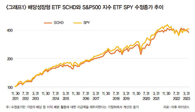 두 ETF가 이처럼 여러 면에서 비슷한데도 SCHD가 인기를 끄는 이유 중 하나는 배당률 때문이다(참고로 SPY의 시가총액은 4097억 달러로 SCHD의 9배 수준이다). SCHD가 3~4% 배당률을 보이는 반면, SPY 배당률은 2% 수준으로 낮다. 투자자 입장에서는 배당률이 높은 SCHD가 좋아 보일 수 있다. 하지만 간과하지 말아야 할 것이 있다. 배당이 높다고 반드시 더 좋은 투자 대상은 아니라는 점이다.