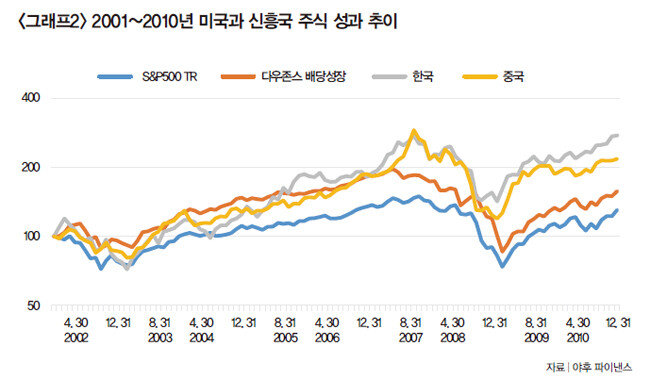 그래서 다우존스 미국 배당 100 지수와 유사한 움직임을 보이면서 장기 데이터가 존재하는 다우존스 미국배당관련지수(Dow Jones U.S. Select Dividend)를 이용해봤다. 이 기간 성과를 보면 미국 S&P500 TR(Total Return·재투자)이 연 3.0%, 다우존스 배당성장이 5.2% 수익률을 보인 반면, 한국 주식은 12.0%, 중국 주식은 9.1% 상승했다. 만약 미국의 향후 10년 성과가 이처럼 신흥국 대비 낮은 모습을 보인다면 SCHD에 대한 맹목적인 믿음은 배신당할 수 있다. 일정 부분 분산투자로 접근할 필요성이 있다는 얘기다.
