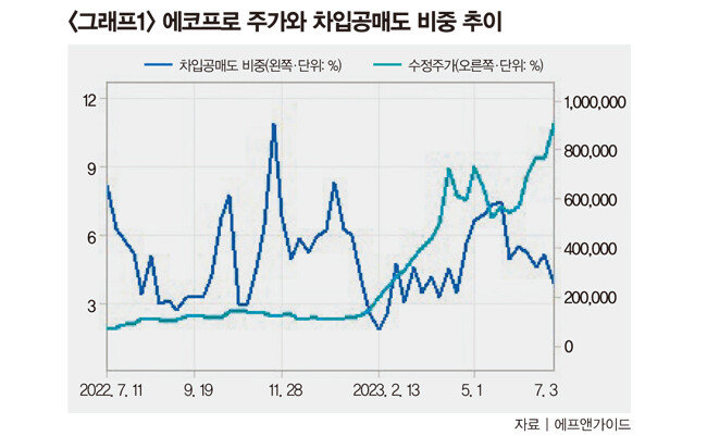 에코프로 급등세에 투자심리도 반전됐다. 그간 시장에는 4월 중 기록한 82만 원이 에코프로 주가의 상한선이라는 인식이 만연했다. 실제로 에코프로는 5월 주가가 22.9% 하락하는 등 조정을 겪었다. 국내외 증권가에서 에코프로에 대해 경고 목소리를 냈고, 이동채 에코프로 회장이 법정 구속되는 일까지 벌어지면서 투자자 이탈이 거듭된 탓이다. 6월 주가가 33.9% 반등해 강세를 보였지만 전고점을 돌파하지 못해 “상단이 검증됐다”는 평가가 많았다. 이 같은 인식이 퍼지자 공매도도 활발히 이뤄졌다.